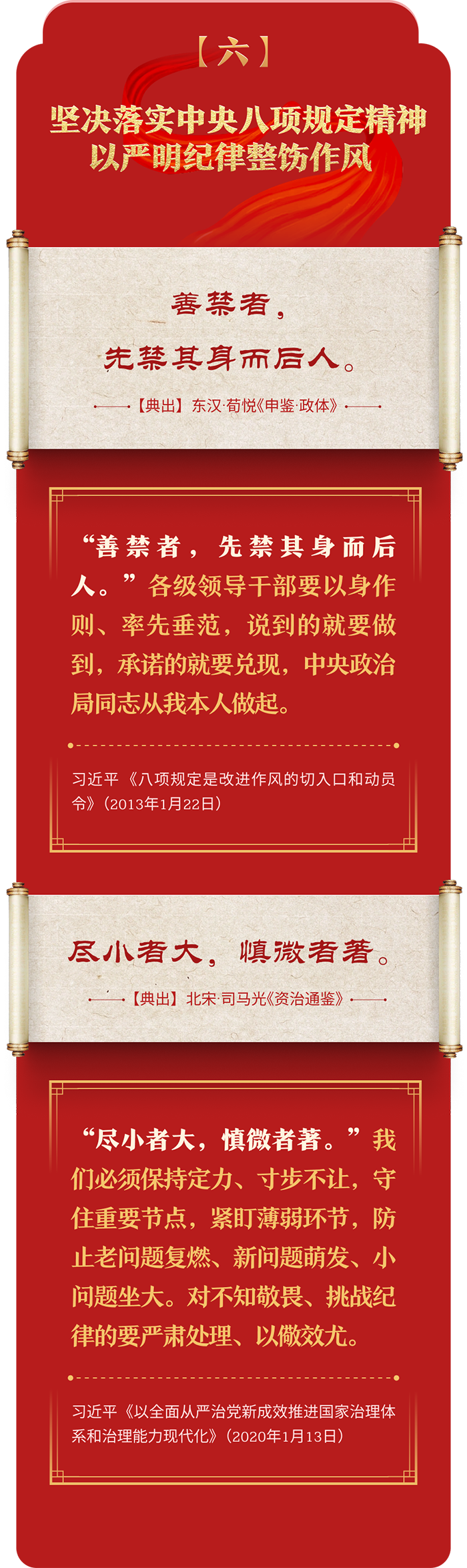 編者按:加強(qiáng)紀(jì)律建設(shè)是全面從嚴(yán)治黨的治本之策。黨的十八大以來,習(xí)近平總書記圍繞全面加強(qiáng)黨的紀(jì)律建設(shè)發(fā)表一系列重要論述,立意高遠(yuǎn),內(nèi)涵豐富,思想深刻,引導(dǎo)黨員干部學(xué)紀(jì)、知紀(jì)、明紀(jì)、守紀(jì),真正把紀(jì)律規(guī)矩轉(zhuǎn)化為政治自覺、思想自覺、行動自覺,確保全黨目標(biāo)一致、團(tuán)結(jié)一致、步調(diào)一致。在這些重要論述中,總書記精妙運(yùn)用古代典籍經(jīng)典名句,以古喻今、啟迪思想、激蕩精神,讓我們一起來學(xué)習(xí)!