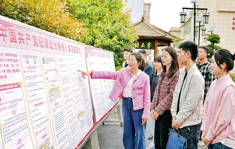 在全黨開展黨紀學習教育,是加強黨的紀律建設、推動全面從嚴治黨向縱深發(fā)展的重要舉措。連日來,各地區(qū)各部門各單位精心謀劃部署、抓住學習重點,推動黨紀學習教育走深走實。圖為2024年4月10日,江西省蘆溪縣紀委監(jiān)委干部在《中國共產黨紀律處分條例》學習宣傳欄前交流。 鄧建萍/攝