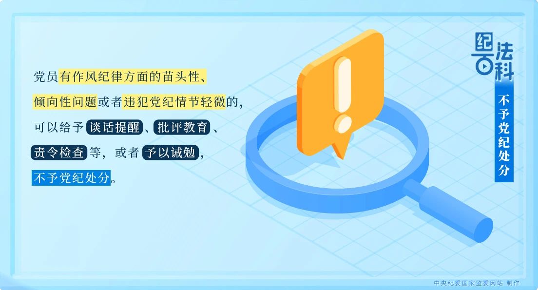 《中國共產(chǎn)黨紀律處分條例》第十九條第二款規(guī)定:黨員有作風(fēng)紀律方面的苗頭性、傾向性問題或者違犯黨紀情節(jié)輕微的,可以給予談話提醒、批評教育、責(zé)令檢查等,或者予以誡勉,不予黨紀處分。